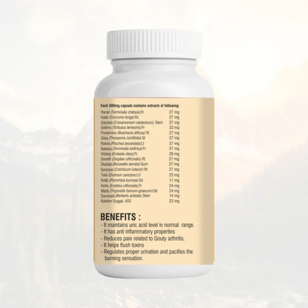 Herbal capsules designed to manage uric acid levels and support relief from joint pain, swelling, and gout-related discomfort.